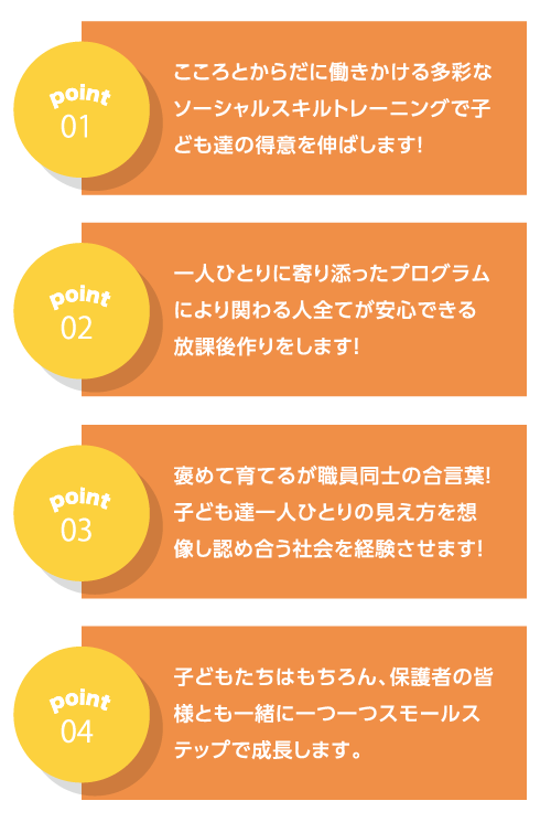 日々の子育てでお疲れの親御さん、毎日仕事で忙しい親御さんが安心してお子さんを預け、悩みや相談事を気軽に話すことのできる憩いの場でもありたいと思っています。